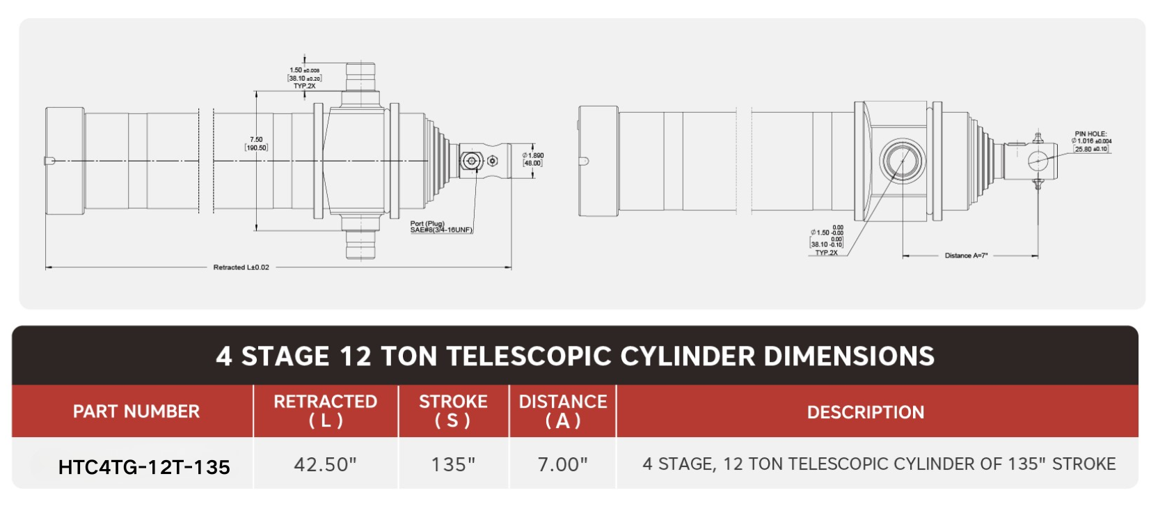 "HTC4TG-12T-135", 4 Peringkat, 12 Tan Daripada 135" Silinder Teleskopik Lejang